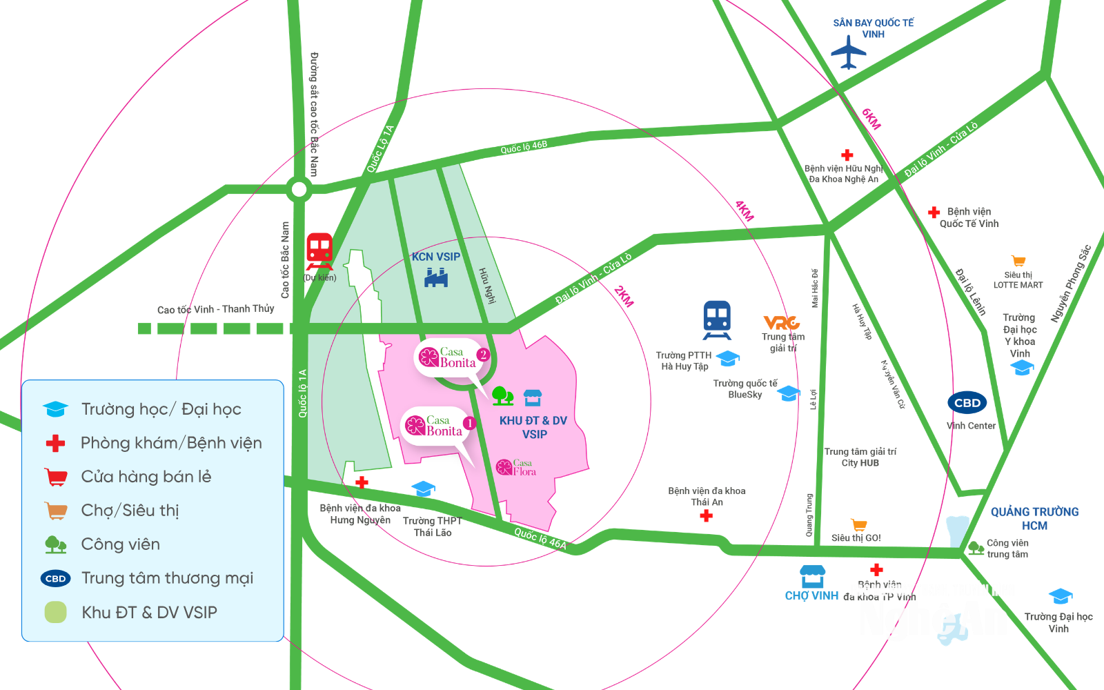 Cảng nước sâu Cửa Lò đang được tỉnh nâng cấp giúp thúc đẩy logistics, biến trục Vinh – Cửa Lò thành cửa ngõ xuất nhập khẩu của khu vực. Ga đường sắt tốc độ cao là một dấu mốc mới. Theo quy hoạch, ga Vinh sẽ là điểm dừng quan trọng trên trục Bắc – Nam. Việc Casa Bonita nằm gần các điểm kết nối giao thông đa phương thức này giúp cư dân dễ dàng tiếp cận với các xu hướng di chuyển hiện đại trong tương lai.
